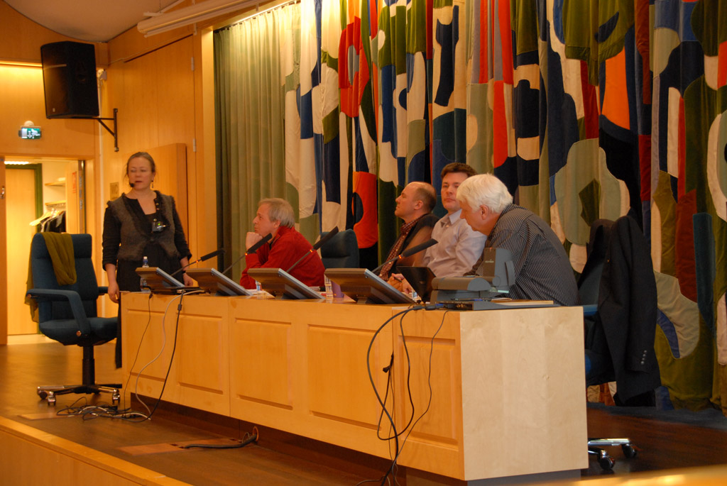 Agneta Setterwall leads a dialogue between Roger Olsson from Svenska Rovdjursföreningen, Sven Erik Hammar from Lantbrukarnas Riksförbund, Mikael Karlsson from Naturskyddsföreningen and Hans-Bertil Granewald from Jägarnas Riksförbund.
