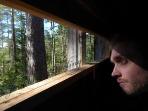 Emil and I go into the reconstructed little hut at around 16:00, and after installing ourselves, sitting in our sleeping bags with cameras ready to use, we begin what will become a silent night, whispering and being as still as we can in order not to scare animals away. We begin spotting intensively at the surroundings through the thin glass windows of the hut.