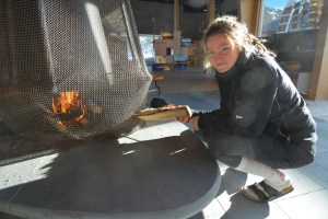 Manager Jenny Carlsson tends to the fireplace at the visitor center Naturum Laponia in Stora Sjöfallet National Park.
